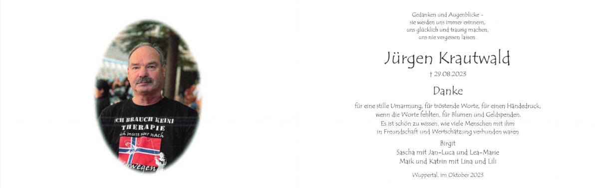Liebe Birgit, lieber Maik und Sascha, das Foto welches ihr heute aufgestellt habt - mit diesem T-Shirt - spiegelt ihn so sehr wieder. Jürgen's Humor hat mich seit meiner Kindheit immer wieder begleitet und ich mochte ihn so sehr. Er hat damals meine zweite Wohnung mit renoviert und nach seiner Arbeit für mich Laminat verlegt. ❤️ Jürgen war ein lustiger und herzensguter Mensch, er war mit dir Birgit, am 25.12.2019 mitten in der Nacht bei uns im Krankenhaus und hat Mama in den Armen gehalten. Ich habe noch seine Worte im Ohr und seine Traurigkeit vor Augen über den Tod seines so guten Freundes. So war Jürgen, er war immer da, hilfsbereit und immer für ein Lachen zu haben. Wir haben uns so sehr gewünscht, dass er den Kampf gegen den Krebs und die Chemotherapie schafft, doch leider hat er diesen Kampf verloren. Wieder einmal ist ein wunderbarer Mensch von uns gegangen, der viel zu jung war. Es tut uns so unendlich leid und wir wünschen euch von ganzem Herzen viel Kraft und Zuversicht für die bevorstehende Zeit. "Krauti, trink dein Bierchen mit Papa und Olli da wo ihr jetzt seid" 💫💗🫶
